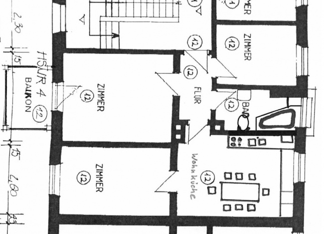 Flur, kleineres Arbeits- oder Kinderzimmer, sehr schönes Bad mit Wanne in Erkersituation vor dem Fenster, Waschbecken und WC, Wohnküche mit Einbauküche (optional) und Essplatz, Schlafzimmer, Wohnzimmer mit Beistellofen (optional) und Balkontüre.