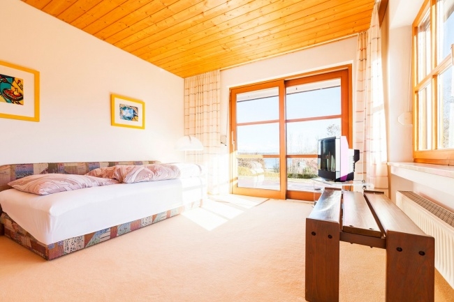 Erdgeschoss: Windfang, Garderobe, WC, Abstellkammer Badezimmer so wie zwei Schlafzimmer mit Balkontüre zur großen Terrasse mit Seeblick auf den Ammersee.