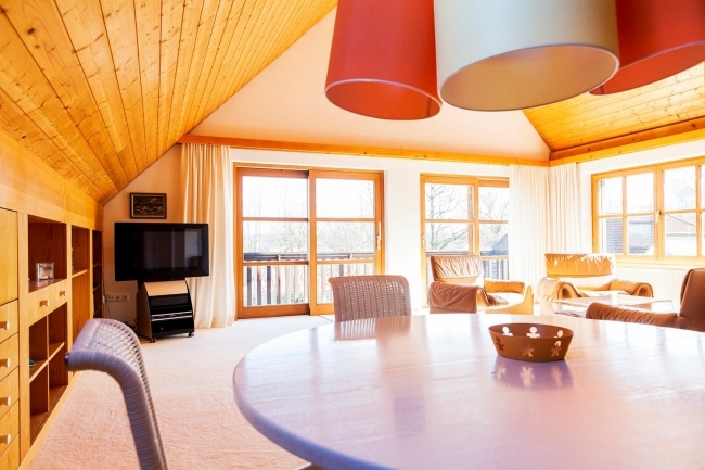 Obergeschoss: Großes, helles Wohn-Esszimmer mit Balkon und Blick auf den Ammersee, Küche, Schlafzimmer, Bad und WC.