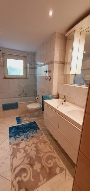 Es Gibt ein Badezimmer mit WC, Wanne, Doppelwaschtisch und Fenster. Flur mit kleiner Speis und Rundbogen in den Wohnraum.