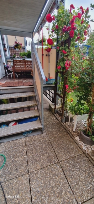 Balkontüre, Treppe vom Balkon in den Garten, Garten mit Platz für Pool und Trampolin.