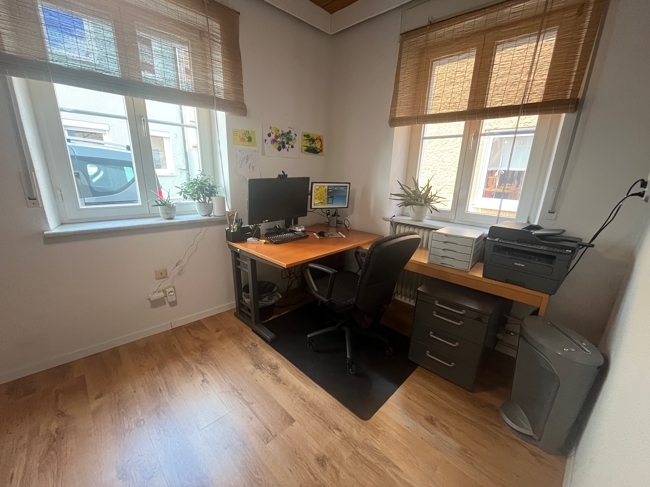 Es gibt zwei Eingänge in das Haupthaus, der Laden im Erdgeschoss ist als Lager vermietet. Die Hauptwohnung erstreckt sich über Teile des Erdgeschosses und des Obergeschosses. Das Dachgeschoss ist ausgebaut und kann als separate Wohnung genutzt werden. Der Dachspitz ist nicht ausgebaut, es gibt einen kleinen Lagerkellerraum und einen kleinen Garten, sowie diverse Lagerräume.