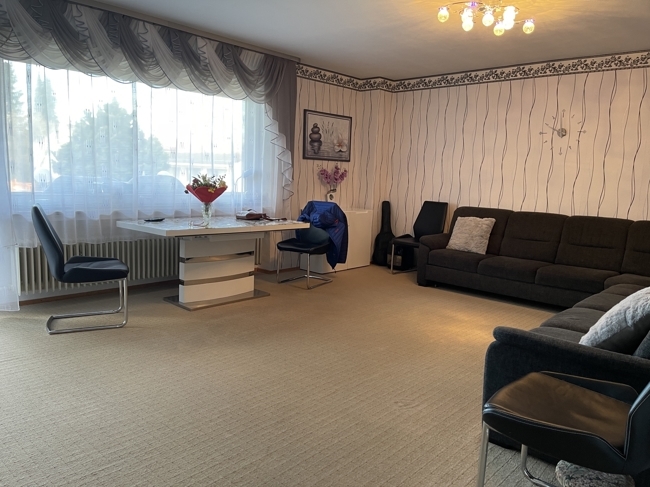 EG Wohnung: Flur, kleines Zimmer, Bad mit Wanne, Dusche, Waschbecken, WC und Fenster; Schlafzimmer mit Terrassentüre, großes Wohnzimmer mit Terrassentüre, großer Durchgang zum Esszimmer, Küche, Abstellraum. Vom Esszimmer aus gelangt man in einen Anbau mit Durchgangsraum zum ehemaligen Innenpool der vor Jahren stillgelegt und geschlossen wurde so dass das ehemalige Hallenbad als Studio, Hobbyraum oder Büro genutzt werden kann.