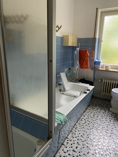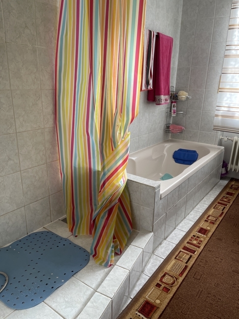 Obergeschoss: Separates Zimmer mit Waschbecken; Bad mit Wanne, Dusche, Waschbecken, WC und Fenster; Schlafzimmer mit Terrassentüre, großes Wohnzimmer mit Terrassentüre,