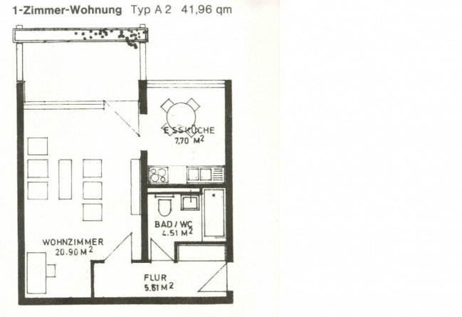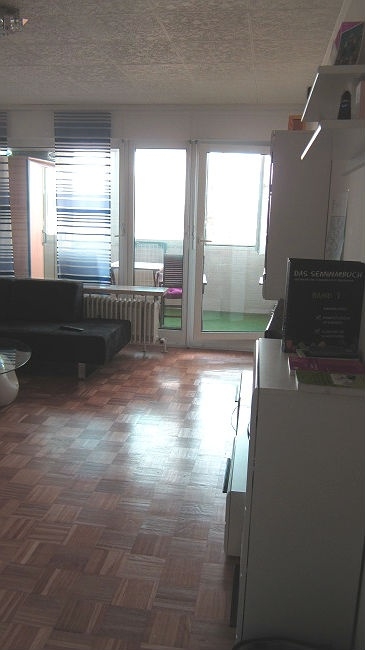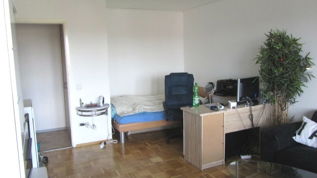 Eingangsbereich, Bad mit Wanne, WC und Waschbecken sowie Platz für eine Wachmaschine; Wohnzimmer mit Eichenparkett, Nische für ein Bett, Balkontüre und Durchgang in die Wohnküche.
