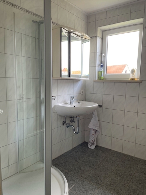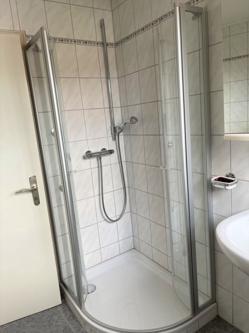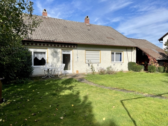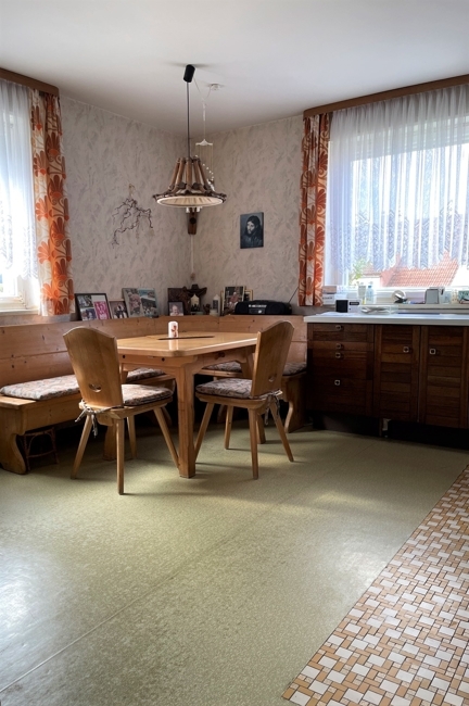 4 Zimmer in unterschiedlichen Größen, Bad (schon renoviert) mit Wanne, Dusche und Fenster, separates WC, Speisekammer, große Wohnküche, Flur mit Terrassentüre nach Süden.