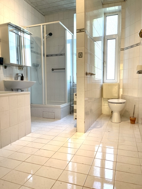 Saniertes Bad mit, sep. WC, Waschbecken, Dusche mit Duschkabine, Wanne, zwei Fenster;
