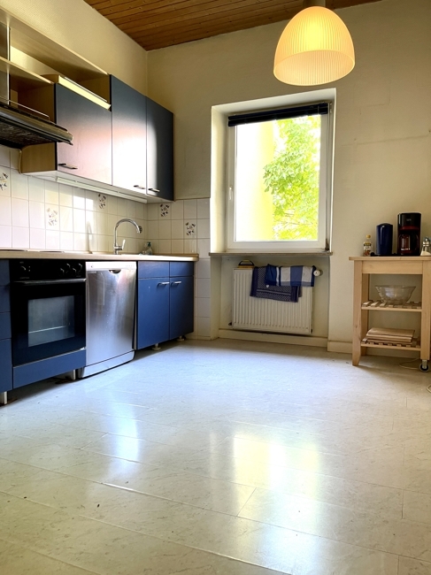 Wohnküche mit Einbauküche, hier gab es in der Vergangenheit einen Außenbalkon in den ruhigen Innenhof der wegen statischen Problemen vorsichtshalber demontiert wurde. Möglicherweise könnte hier wieder ein Balkon angebaut werden.