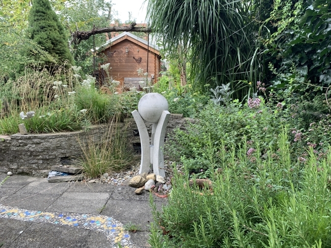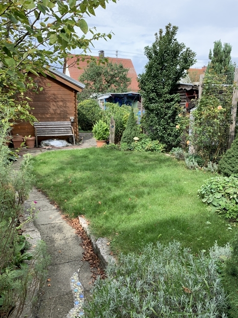 Der liebevoll angelegte Garten ist auch über den Hinterhof erreichbar. Es gibt ein Gartenhaus und eine kleine Garage.
