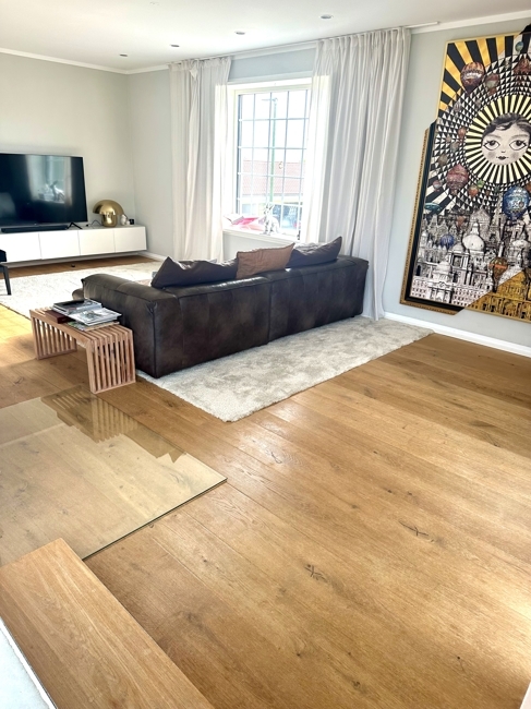 - Im Wohnzimmer raumlange Eichendielen- ca. 9m