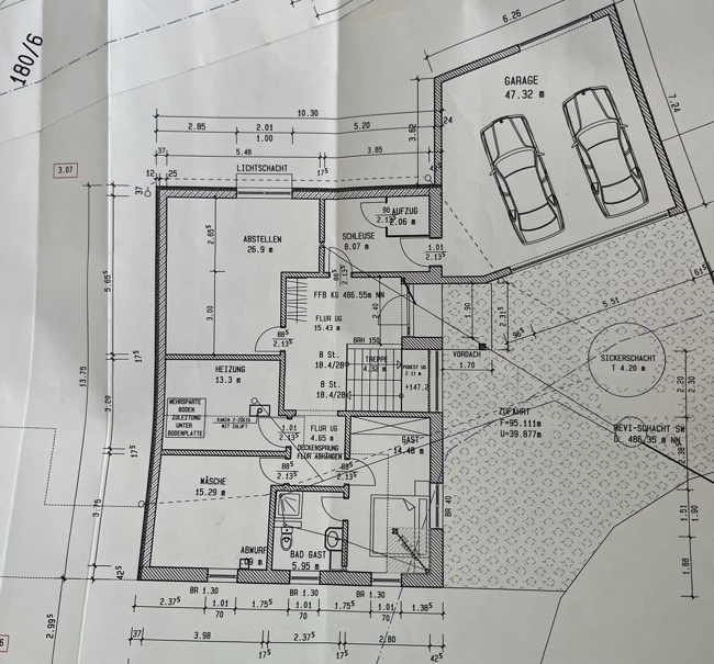 großer Flur mit abgetrenntem Raum (Garderobe) mit Aufzug in die Speisekammer im OG und Durchgang in die übergroße Doppelgarage mit dahinterliegender Werkstatt (ca. 40 m²); Fitnessraum mit Weichboden und Kletterwand; Heizraum mit Luft-Wärmepumpe, Waschküche inkl. Wäscheabwurfschacht; Hobbyraum auch als Büro oder Gästezimmer nutzbar; Duschbad mit WC und Waschbecken; Schlafzimmer;