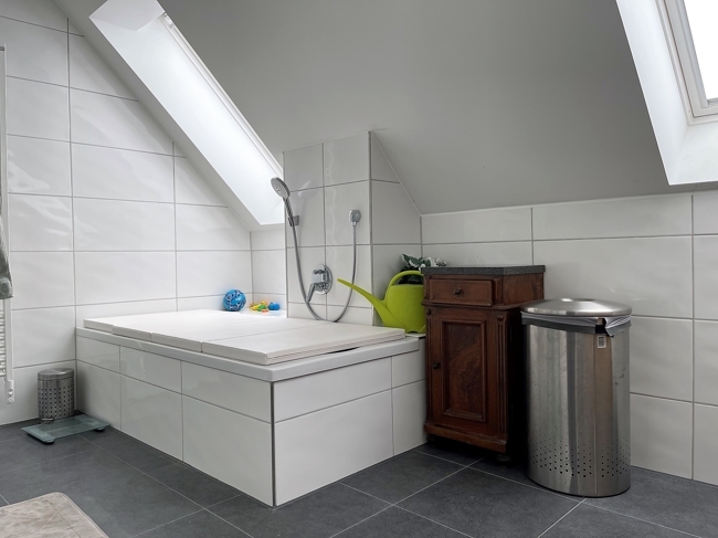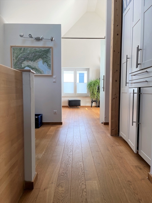 große helle Galerie (bis in den Dachspitz offen), abgetrenntes Zimmer mit Südbalkon, großes, modernes Bad mit Wanne (abdeckbar), Dusche mit Glaswand, Waschbecken, WC, zwei große Dachflächenfenster; Schlafzimmer, Zimmer mit innenliegender Holztreppe in den Dachspitz ideal als Kinderzimmer;