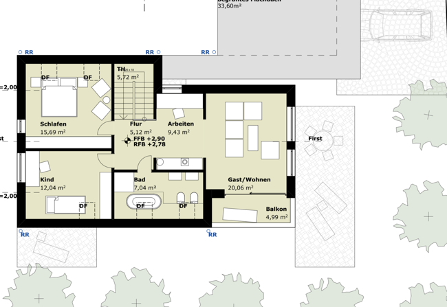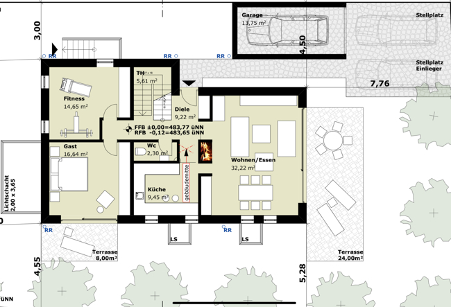 - zentrale Lüftungsanlage mit Sole-Erdwärmetauscher (Kühlung im Sommer Wärme im Winter)