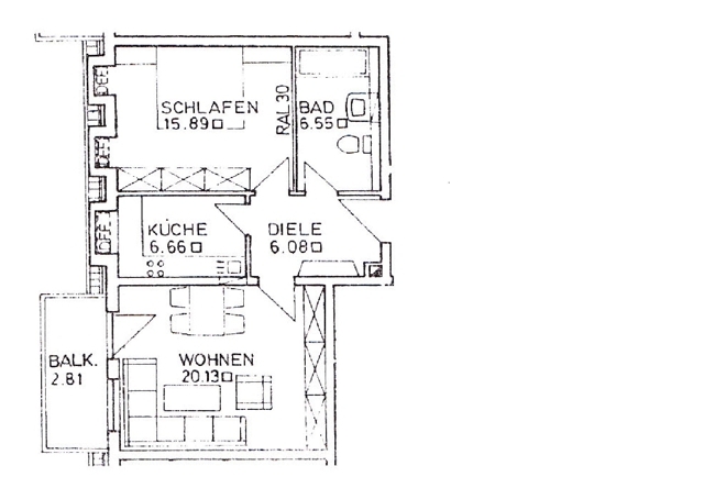 Die Wohnung befindet sich im ersten Stock, Eingangsbereich, großes Wohnzimmer mit größerem Westbalkon, Küche, Schlafzimmer, großes Bad mit Wanne und Platz bzw. Anschluß für die Waschmaschine.