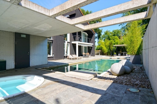 Großer, bodentiefer, betonierter, beheizbarer Außenpool, runder Whirlpool,