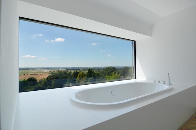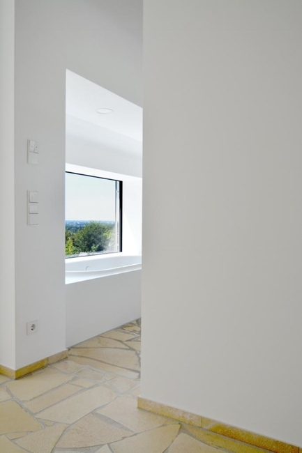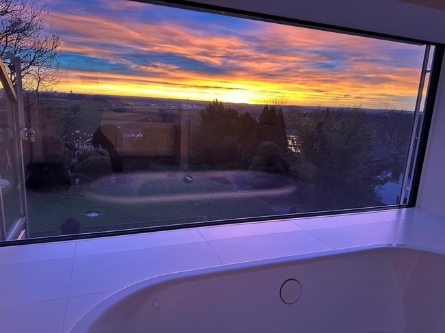 - Bad mit Badewanne vor Panoramafenster mit Blick auf Augsburg und bei Fernsicht auf die Alpen
