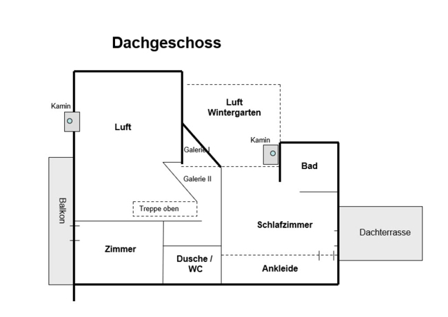 offene Galerie; Panoramabad mit Badewanne, Waschbecken und WC, offenes Schlafzimmer mit Westbalkon und begehbarem Kleiderschrank; Duschbad mit Waschbecken, WC und Fenster; Bibliothek mit Einbaumöbel und Bücherregalen mit verschiebbarer Leiter und Balkontüre zum Ostbalkon;