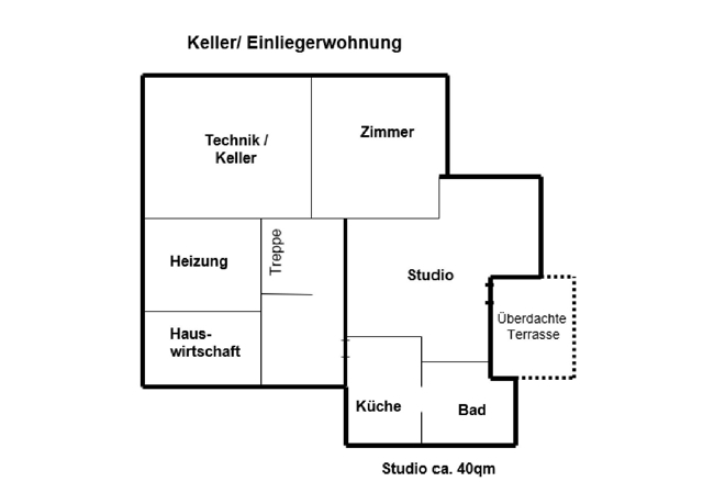 Einliegerwohnung mit Bad (Badewanne, Waschbecken, WC), Küche und großem Raum mit Einbaumöbeln (Doppel-Schrankbett) und Terrassentüre; Lagerraum mit Tageslicht und Heizungsraum; Technikraum; Heizung mit Pufferspeicher.