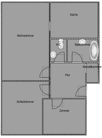 Flur mit Abstellkammer, zwei Schlafzimmer, großes helles Wohn-Esszimmer mit Balkontüre und Durchgang in die Küche (Einbauküche inklusive); separates WC, Bad mit Wanne und Platz für eine Wachmaschine.