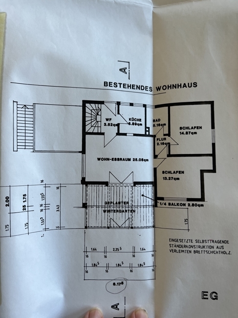 EG: Eingang, Küche, Wohnzimmer, Wintergarten, zwei Schlafzimmer, Bad mit Wanne, Waschbecken, Fenster (Stand 60er Jahre).
