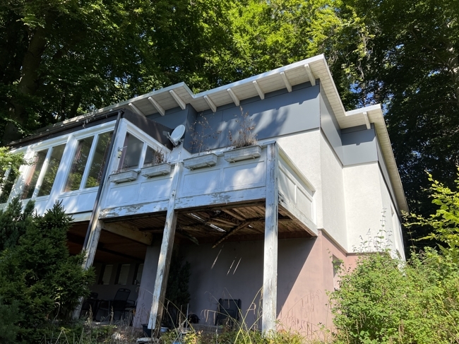 Es gibt einen Wintergarten sowie einen Balkon (morsch) und Terrassen auf der Süd- und Westseite.