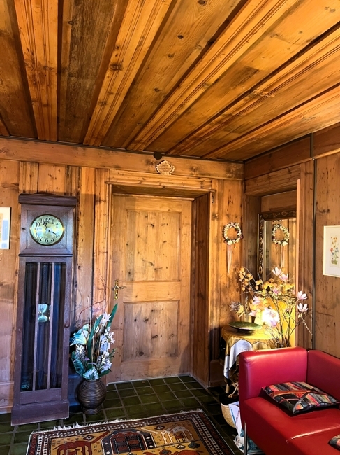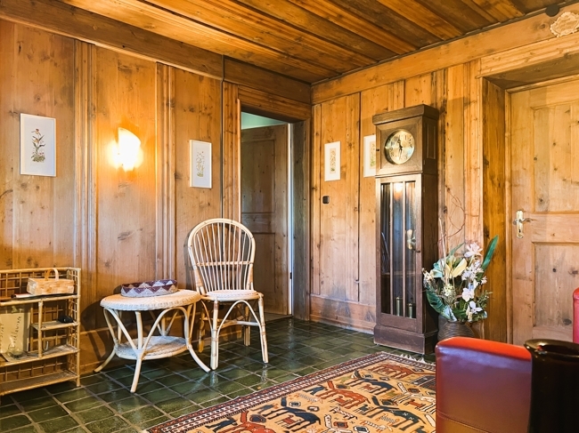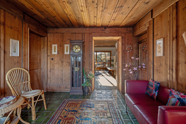 Die Eingangsdiele ist Holz vertäfelt, repräsentative Halle mit Massivholz Treppe und Holzdecke sowie Kachelofen und Fensterfront in den Garten, großes Wohnzimmer ein weiteres kleineres Zimmer sowie ein Duschbad, Esszimmer, Küche und Speis mit mehreren Ausgängen auf der Terrasse.