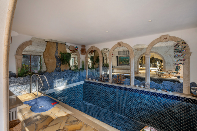Waschkeller, kleines Bad, Heizungsraum, Wellness Bereich mit Hallenbad, Whirlpool, Sauna und Dusche, Büro mit separatem Eingang und anschließender Werkstatt; Einliegerwohnung mit separatem Eingang kleiner Küche und Bad