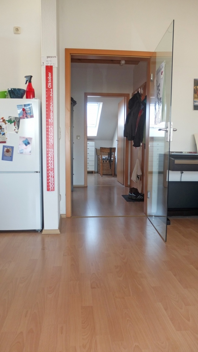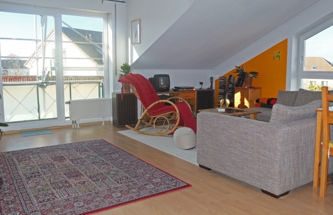 Es gibt ein großes Wohn-Esszimmer mit offener Küche, sowie eine große Gaube mit Südbalkon; Bad mit Wanne, separater Dusche, WC und Fenster; Schlafzimmer und eine Abstellkammer.