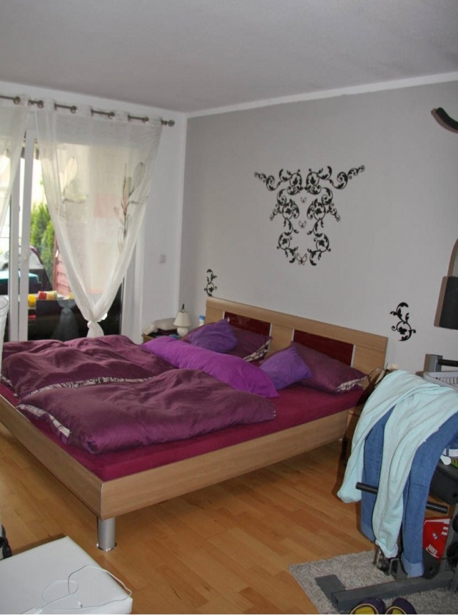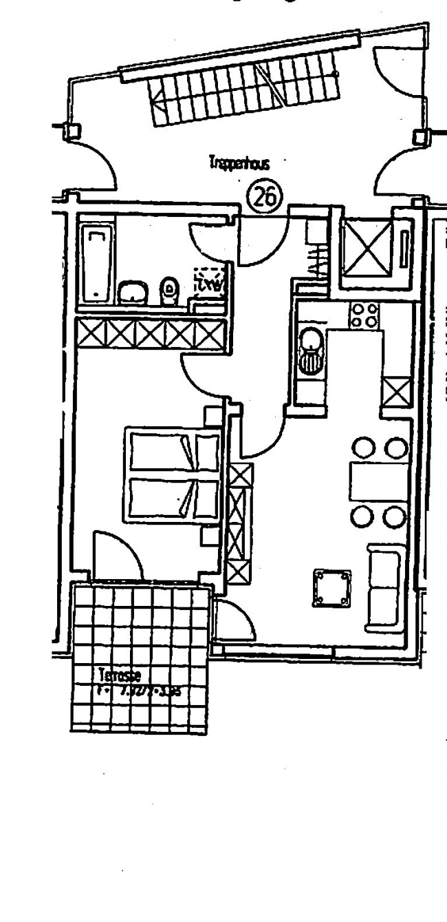 Eingangsbereich mit Garderobe; Bad mit WC, Wanne und Waschmaschinenanschluss; geräumiges Schlafzimmer mit Terrassentüre; größeres Wohn- Esszimmer mit separater kleinerer Küche. Eigener, eingezäunter Garten mit Gartentüre in den Innenhof.