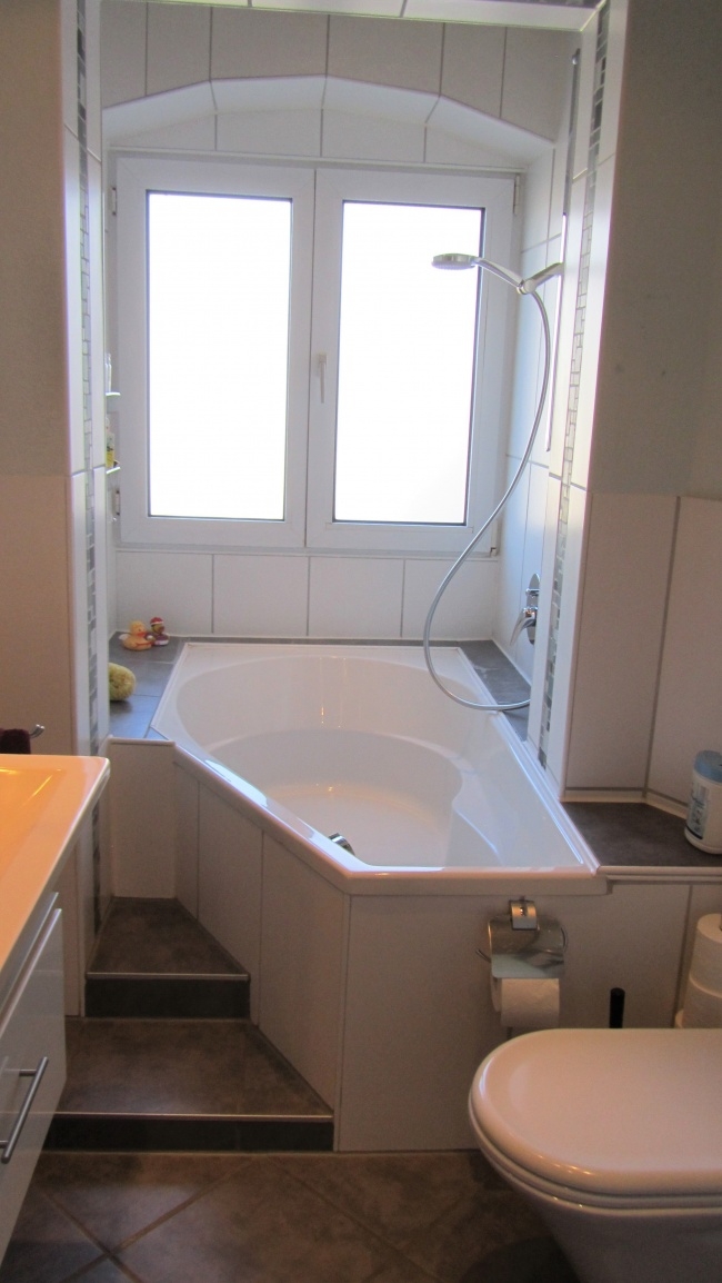 Flur, kleineres Arbeits- oder Kinderzimmer, sehr schönes Bad mit Wanne in Erkersituation vor dem Fenster, Waschbecken und WC, Wohnküche mit Einbauküche (optional) und Essplatz, Schlafzimmer, Wohnzimmer mit Beistellofen (optional) und Balkontüre.