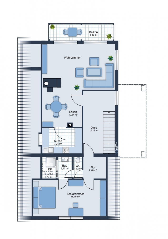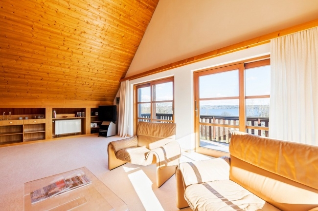 Obergeschoss: Großes, helles Wohn-Esszimmer mit Balkon und Blick auf den Ammersee, Küche, Schlafzimmer, Bad und WC.