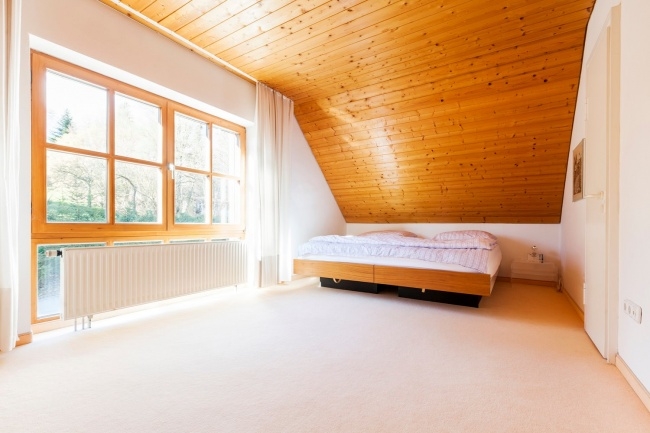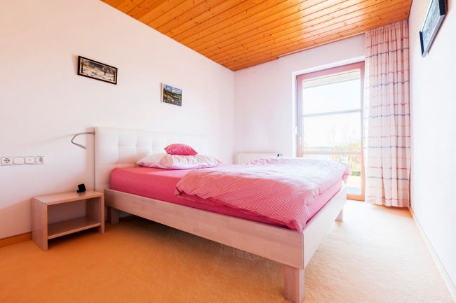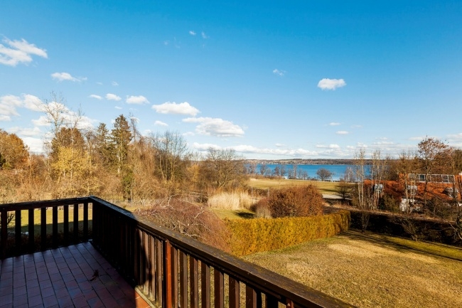 Erdgeschoss: Windfang, Garderobe, WC, Abstellkammer Badezimmer so wie zwei Schlafzimmer mit Balkontüre zur großen Terrasse mit Seeblick auf den Ammersee.