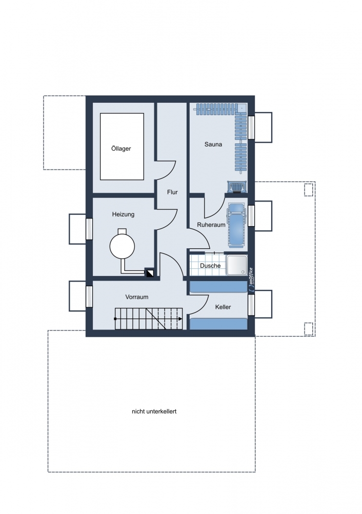Keller: Gefliest Kellerräume zum Ausbau für eine Sauna bzw. Wellnessbereich, Heizungsraum und Waschküche.