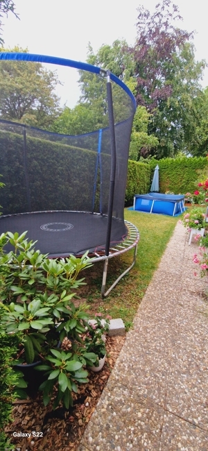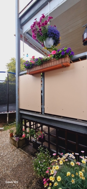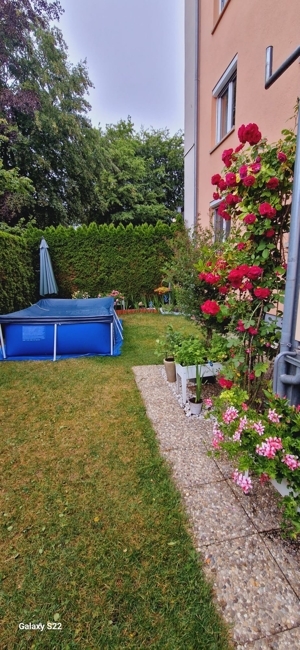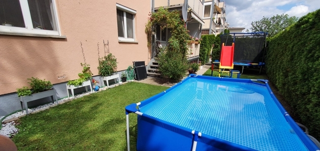Balkontüre, Treppe vom Balkon in den Garten, Garten mit Platz für Pool und Trampolin.