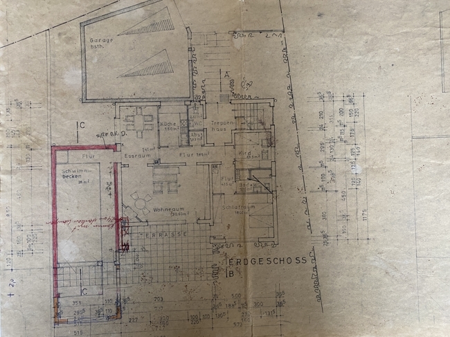 EG Wohnung: Flur, kleines Zimmer, Bad mit Wanne, Dusche, Waschbecken, WC und Fenster; Schlafzimmer mit Terrassentüre, großes Wohnzimmer mit Terrassentüre, großer Durchgang zum Esszimmer, Küche, Abstellraum. Vom Esszimmer aus gelangt man in einen Anbau mit Durchgangsraum zum ehemaligen Innenpool der vor Jahren stillgelegt und geschlossen wurde so dass das ehemalige Hallenbad als Studio, Hobbyraum oder Büro genutzt werden kann.