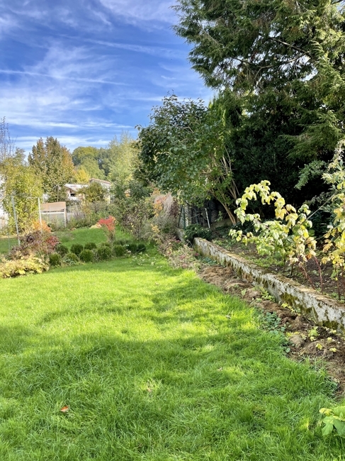 Auf der Nordseite ist die Einfahrt zur Garage sowie der Vorgarten. Auf der Südseite befindet sich der schöne eingewachsene Hauptgarten mit Terrasse und einer überdachten und windgeschützten Pergola mit Gartenhaus.