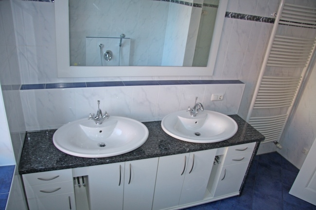 Aufteilung: Wohnküche mit Esszimmer offen zum Wohnzimmer, zwei Schlafzimmer, Bad mit Fenster, Wanne, Dusche und zwei Waschbecken, separates WC mit Fenster.
