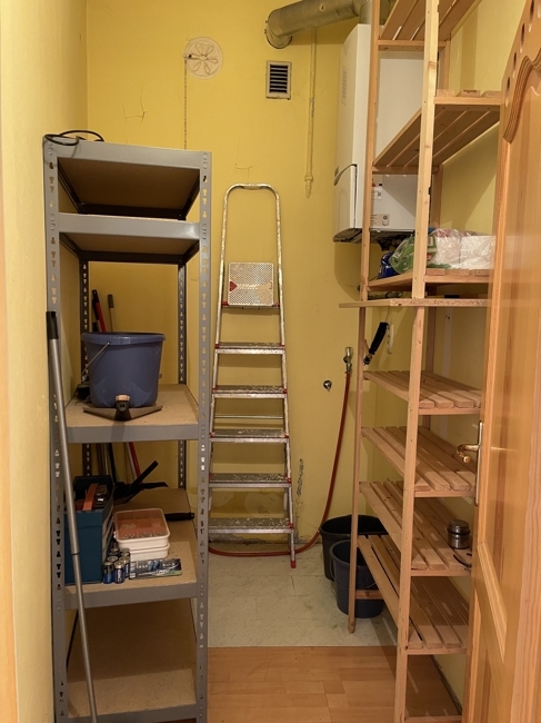 Speise Kammer mit Regalen, Heizung und viel Stauraum.