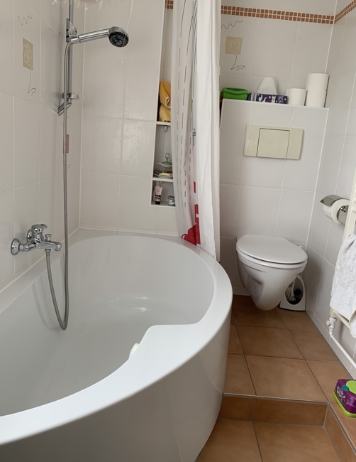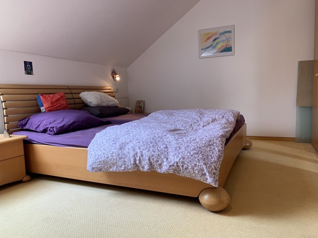 Obergeschoss: Großes Schlafzimmer mit Balkontüre, kleineres Zimmer, Bad mit Wanne, WC und Fenster;