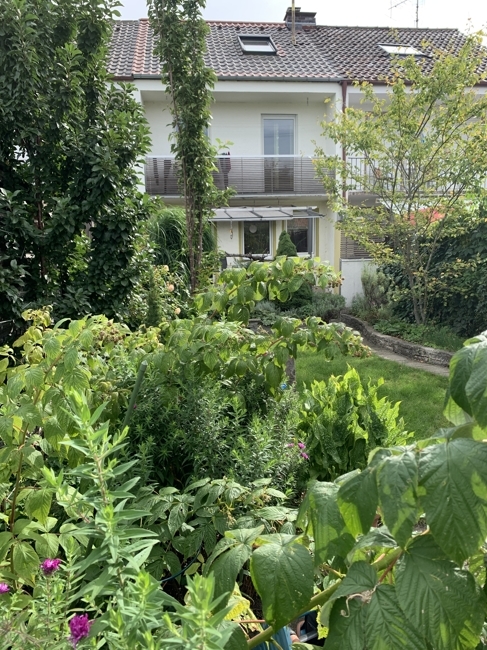 Der liebevoll angelegte Garten ist auch über den Hinterhof erreichbar. Es gibt ein Gartenhaus und eine kleine Garage.