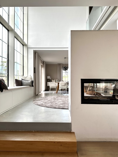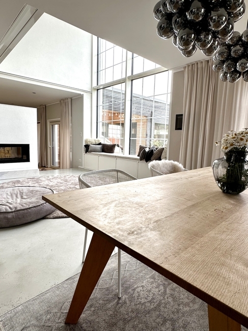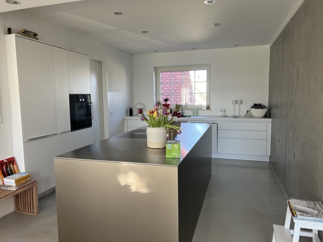 Erdgeschoss: Flur; Gäste WC; sehr großes, helles Esszimmer mit Blick in den Garten, offen zur modernen Bulthaup Küche, Speisekammer, mit Aufzug; das Wohnzimmer ist über den Holzofen und zwei Stufen optisch abgetrennt, raumlange Eichendielen- ca. 9m; Durchgang in ein weiters Zimmer mit Anschlüssen für eine Sauna und Wellnessbereich;