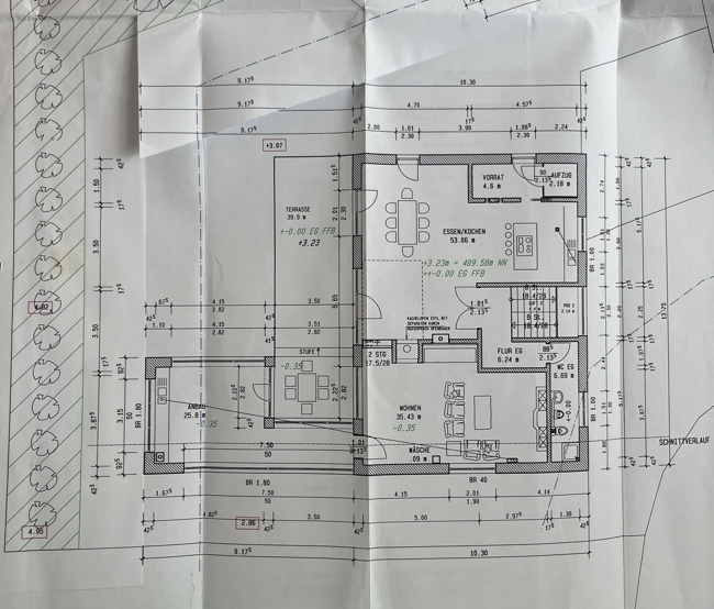 - Im Wohnzimmer raumlange Eichendielen- ca. 9m