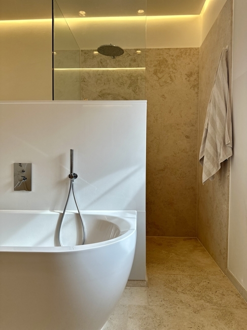 - Modernes Hauptbad mit Wanne, großer Dusche und WC