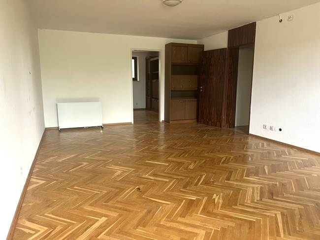 Küche mit Einbaumöbel, großes helles Ess-Wohnzimmer mit riesigen Panoramafenstern Holzofen mit Glastüre, Durchgang auf die riesige, überdachte Südterrasse, Parkettboden; ein weiteres kleineres Zimmer mit sep. WC;