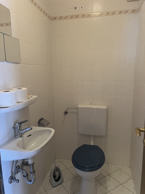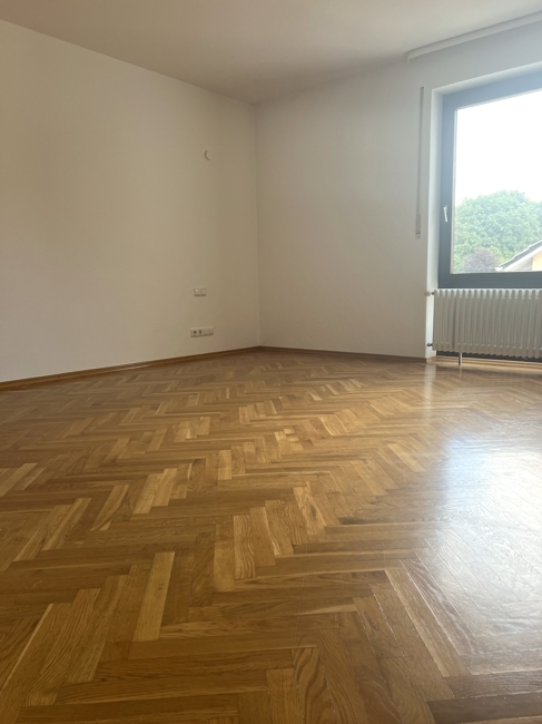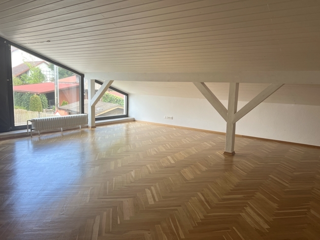 Schlafzimmer mit bodentiefem Fenster und Parkettboden; Bad mit Wanne, Dusche, Fenster, WC und Doppelwaschbecken; ein weiterer großer Raum allerdings durch die Dachschrägen keine Stehhöhe gegeben.