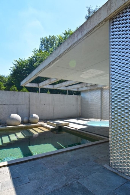 Großer, bodentiefer, betonierter, beheizbarer Außenpool, runder Whirlpool,