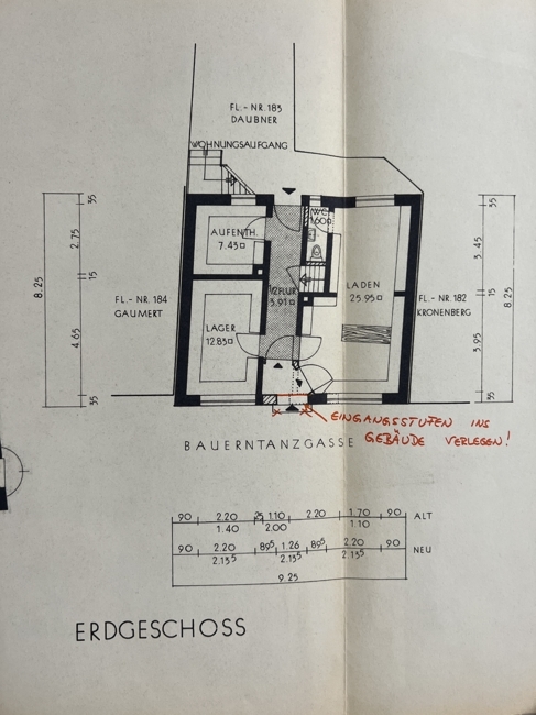 Im Erdgeschoss befindet sich ein kleiner vermieteter Laden mit Lager und zwei großen Schaufenstern, WC und Aufenthaltsraum.