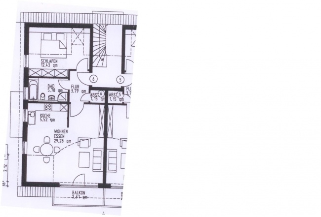 Es gibt ein großes Wohn-Esszimmer mit offener Küche, sowie eine große Gaube mit Südbalkon; Bad mit Wanne, separater Dusche, WC und Fenster; Schlafzimmer und eine Abstellkammer.